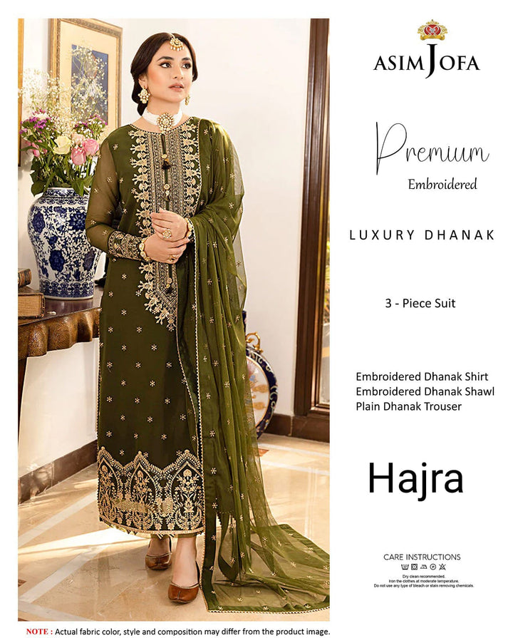 Adorn yourself in the lush, verdant hues of this Olive Green ensemble from ‘The Meerub’, modeled by the graceful Yumna Zaidi. Like the leaves of a flourishing tree, the ethereal Chiffon Georgette shirt, embellished with intricate embroidery on the neckline, front, back, and sleeves, exudes a sense of tranquility and poise. Like the glistening dewdrops that adorn a leaf in the early morning, the golden sequins and threadwork add a touch of radiance and splendor. The embroidered border for the front daman frames the shirt like a beautiful, natural border, while the embroidered dupatta and dyed poly lawn trouser complete the ensemble with subtle elegance.